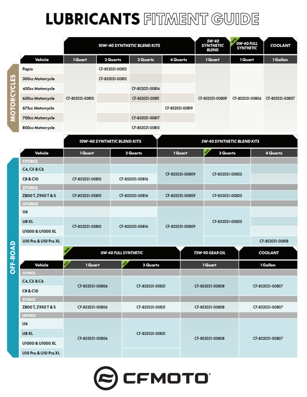 Keep your CFMOTO performing at its best with this complete OEM oil change kit — designed for a precise fit, clean installation, and long-lasting protection.